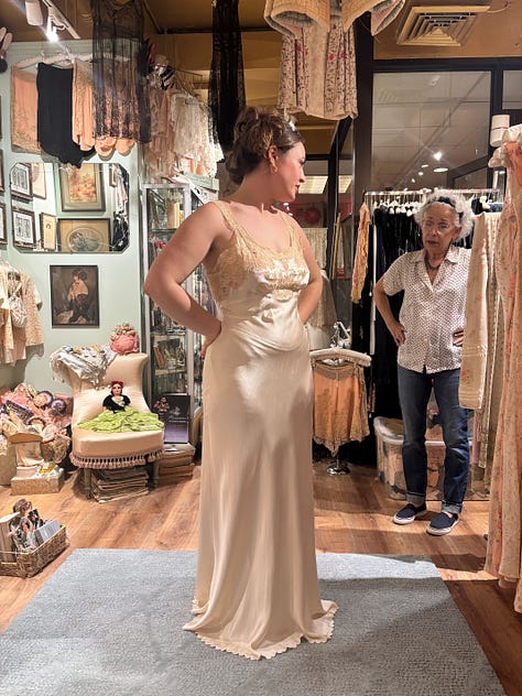 I went to a vintage lingerie shop and found even more shiny satins. The shop lady, who had owned it for fifty years, told me that there was nothing for her in England, for we had wasted all our silk on parachutes. We had an argument about whether I could wear a nightie for my nupitals, and she told me she had worn nighties to both of her son’s weddings (she walked, so Victoria Beckham could run).