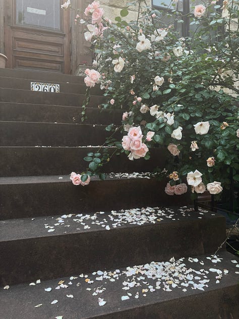 It was the start of June, and the real flowers were as plump as the fabric ones. There were roses the colour of lavender soap. Petals covered brownstone steps and swayed next to flags. Do I want to be a florist?